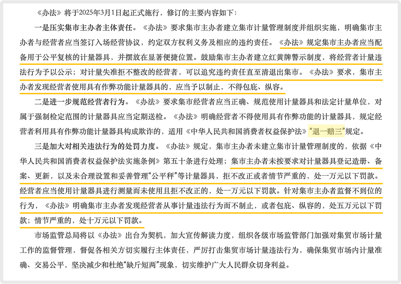○ 2025年3月1日:新版《集貿(mào)市場計量監(jiān)督管理辦法》施行。其中核心變化之一是全面壓實了市場主辦方的管理主體責(zé)任。要求其建立計量管理制度、對場內(nèi)秤具登記備案,并有責(zé)任制止并不得包庇計量作弊行為,否則將面臨高額罰款。這些規(guī)定從市場管理源頭建立了防線,促使市場主動加強(qiáng)對合規(guī)電子計價秤的監(jiān)督與采用。