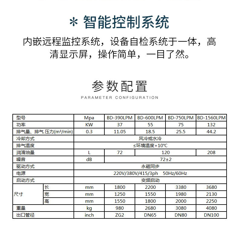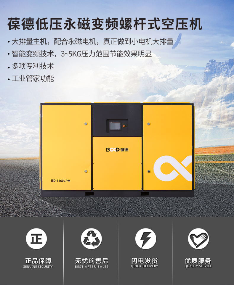 葆德低壓空壓機小電機大排量,智能變頻技術,型號:BD-750LPM、BD-1100LPM、BD-1560LPM、BD-1900LPM、BD-75LPM-Ⅱ、BD-100LPM-Ⅱ、BD-125LPM-Ⅱ、BD-150LPM-Ⅱ、BD-175LPM-Ⅱ、BD-250LPM-Ⅱ、BD-300LPM-Ⅱ、BD-350LPM-Ⅱ